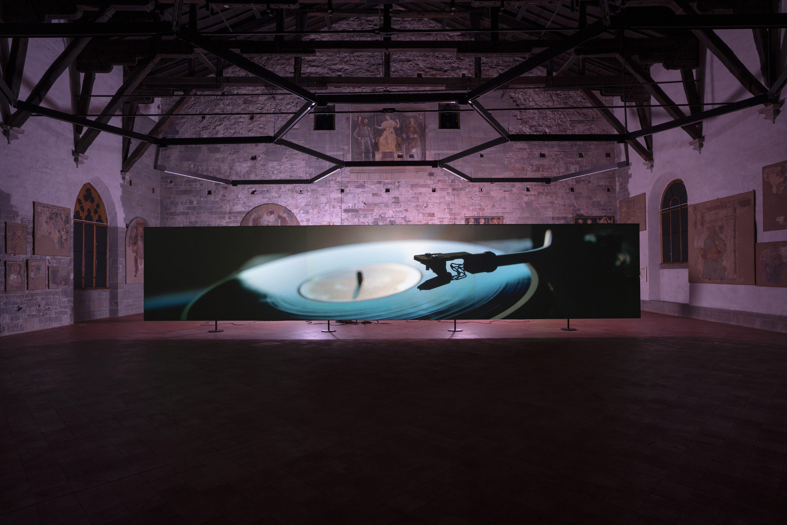 The suspended film and the darkness of the Sala delle Capriate evoke the absence of light and gravity in the universe, the dimension of emptiness in which the record player floats. In the room, the darkness is interrupted at times by flashes of light from lamps positioned to the back of the screen which, following the rhythm of the music, light up the room and, along with it, the paintings and frescoes on the walls. The figures portrayed—among others the Virgin Mary and the city’s patron saints Alexander and Vincent as well as the figure of Justice, and in particular the four minstrel angels who, while intent on playing their instruments (a viola, a cornet, a flute and an organ) appear to dialogue with the four musicians from the Quartet for the End of Time—thus testify to a humanity that exists no more, linking various timeframes, crossing the past, present, and future.