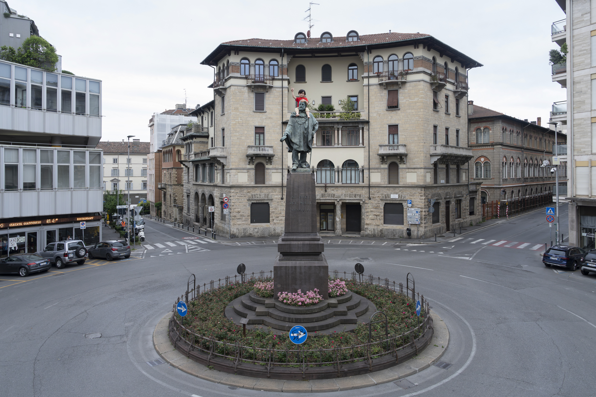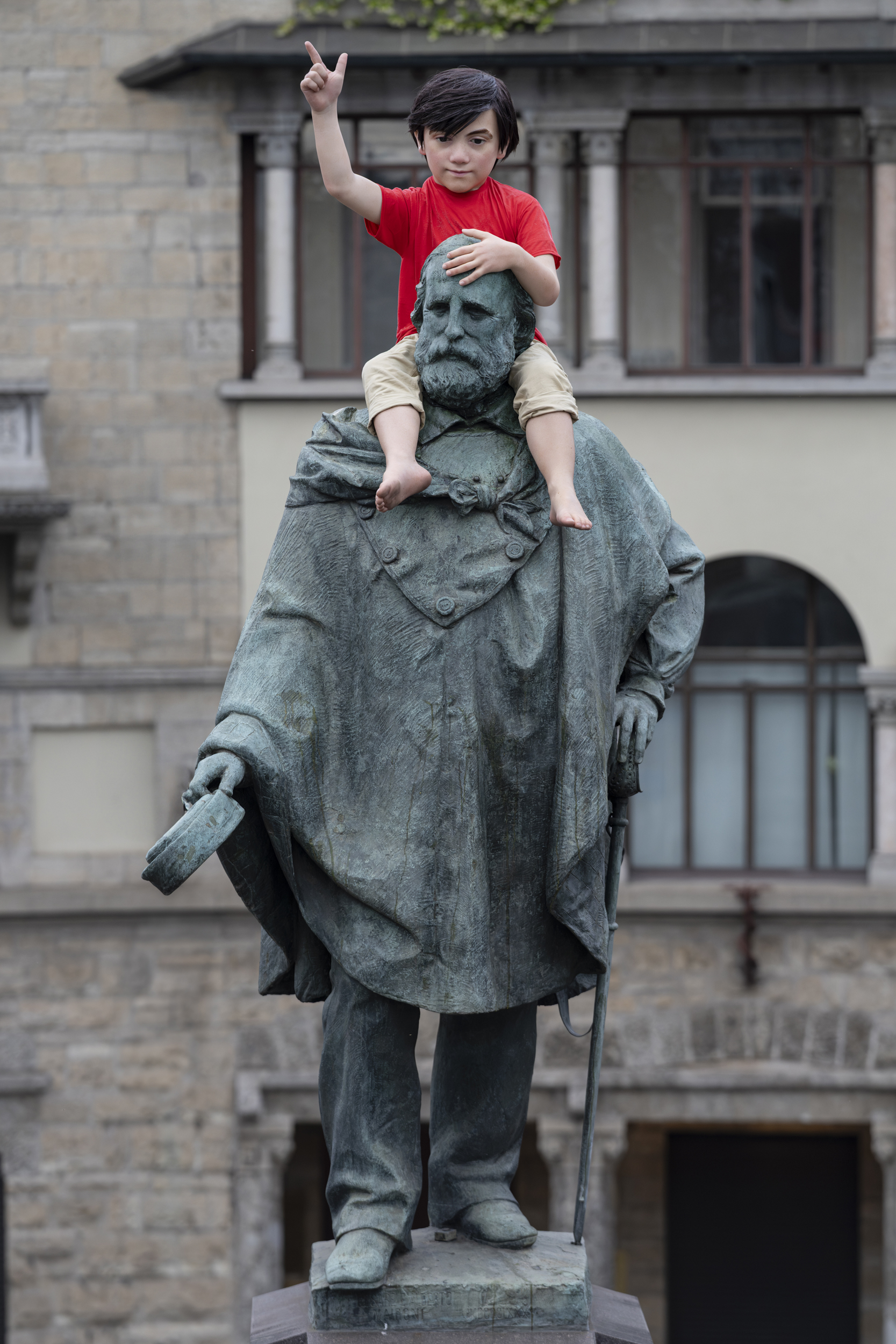 Balancing lightness and tension, One opens up to a dual perspective, both public and personal. On the one hand, it is an intervention that stimulates a confrontation with the national past; while on the other, it narrates the relationship between generations. Who is this “One?” A grandson playing on his grandfather’s shoulders? A little vandal? A rebel? Does it refer to the individuality of the single or to a unified collective force, like the Thousand led by Garibaldi? Is it therefore a new symbol of unity? Or a new generation making a mockery of old values?