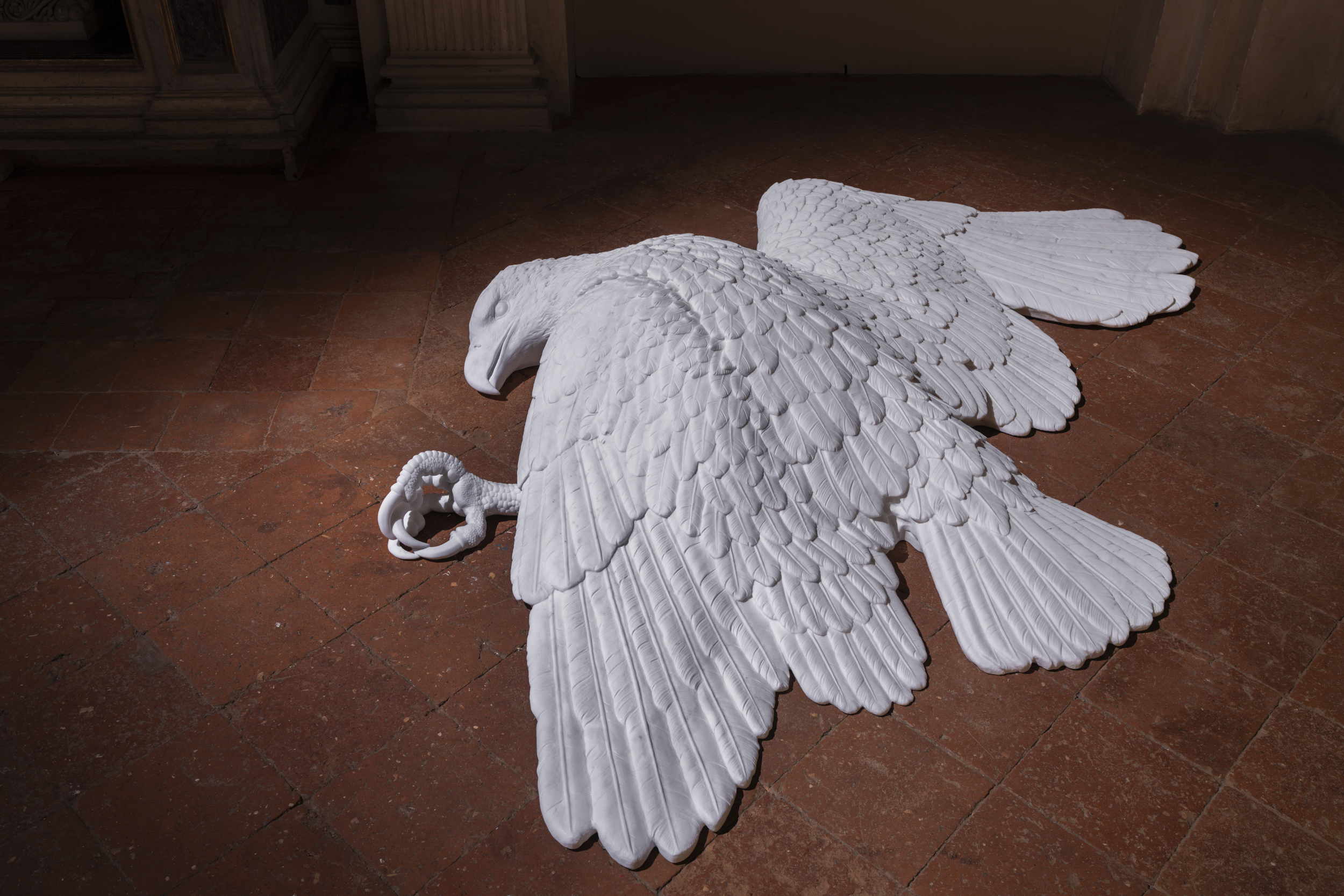 The noble material from which it is produced, Michelangelo statuary marble, used for centuries to celebrate triumphs and immortal virtues, is now deployed here to crystallize a moment of fall, making it eternal and therefore inevitable.