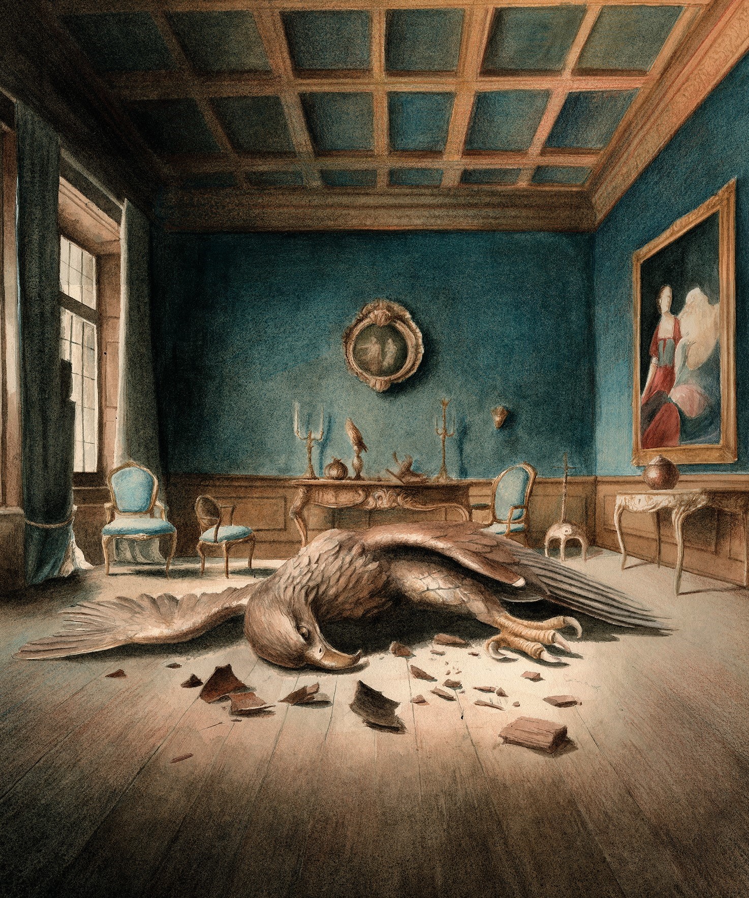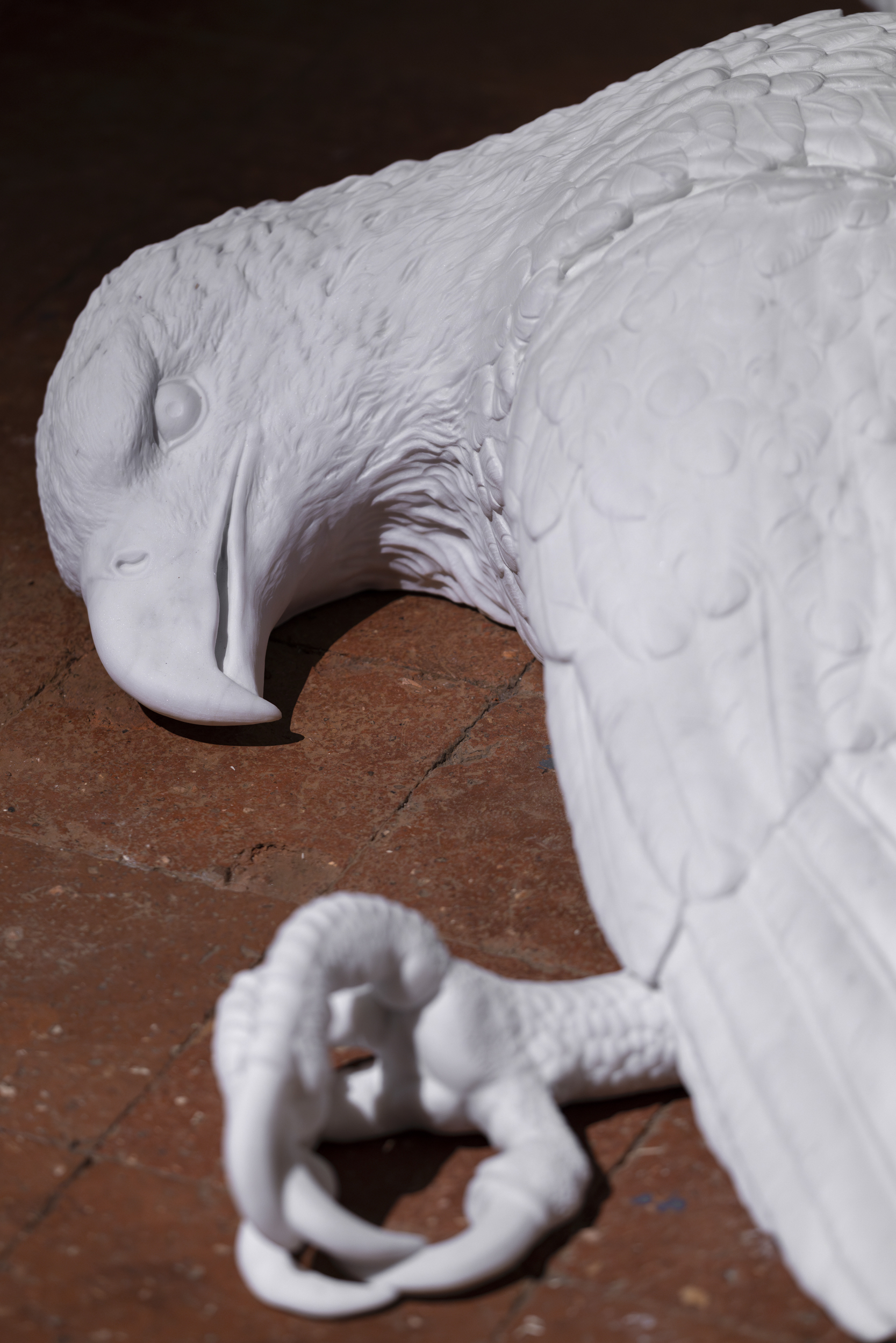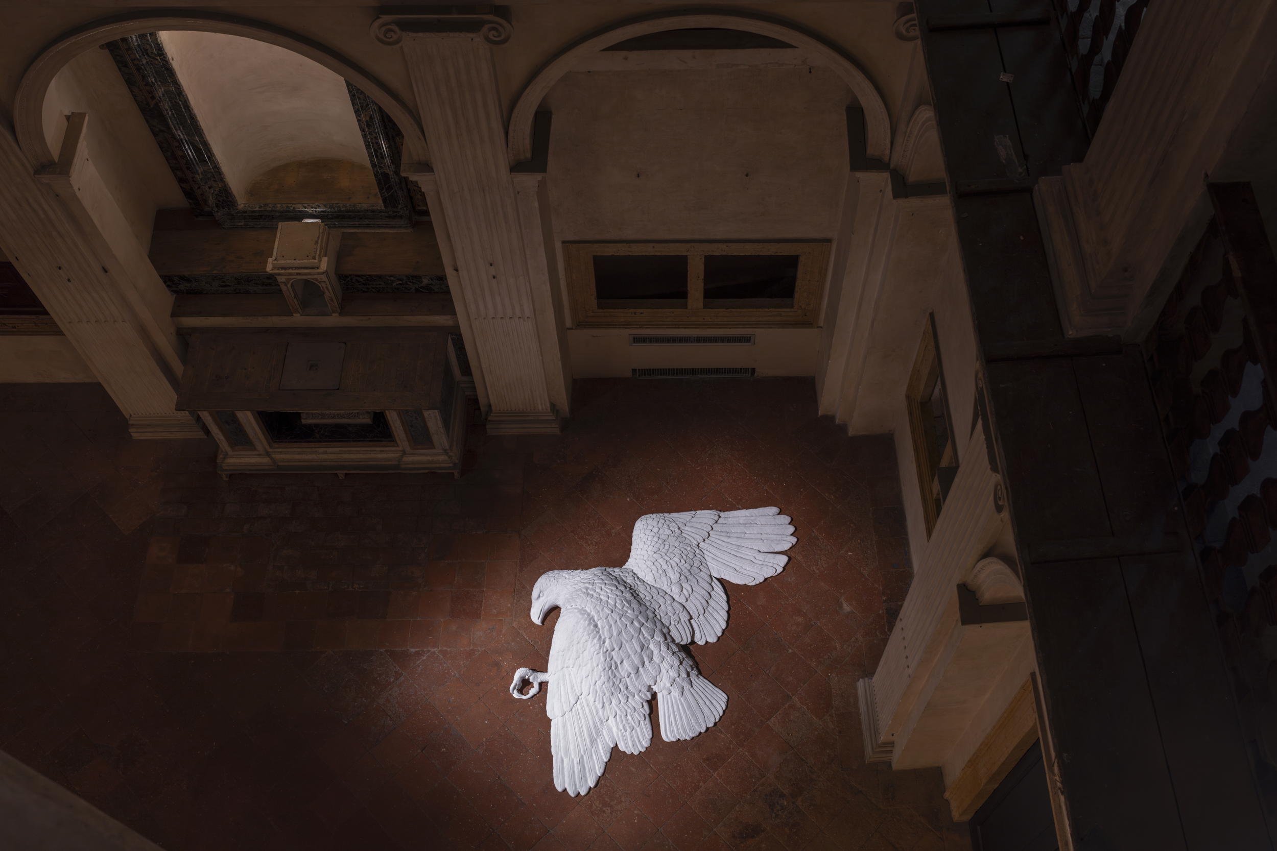 The choice of exhibition venue is not a neutral one. The Oratorio di San Lupo has been a liminal space for centuries: between life and death, between the public and the secret, between devotion and oblivion. The title Bones plays on the tension between appearance and meaning: bones refer to death, to decomposition, but they are also what give structure, support. In this sense, the eagle is not only shot down: it is also unmasked. It is reduced to its ultimate truth, freed from the weight of ideology.