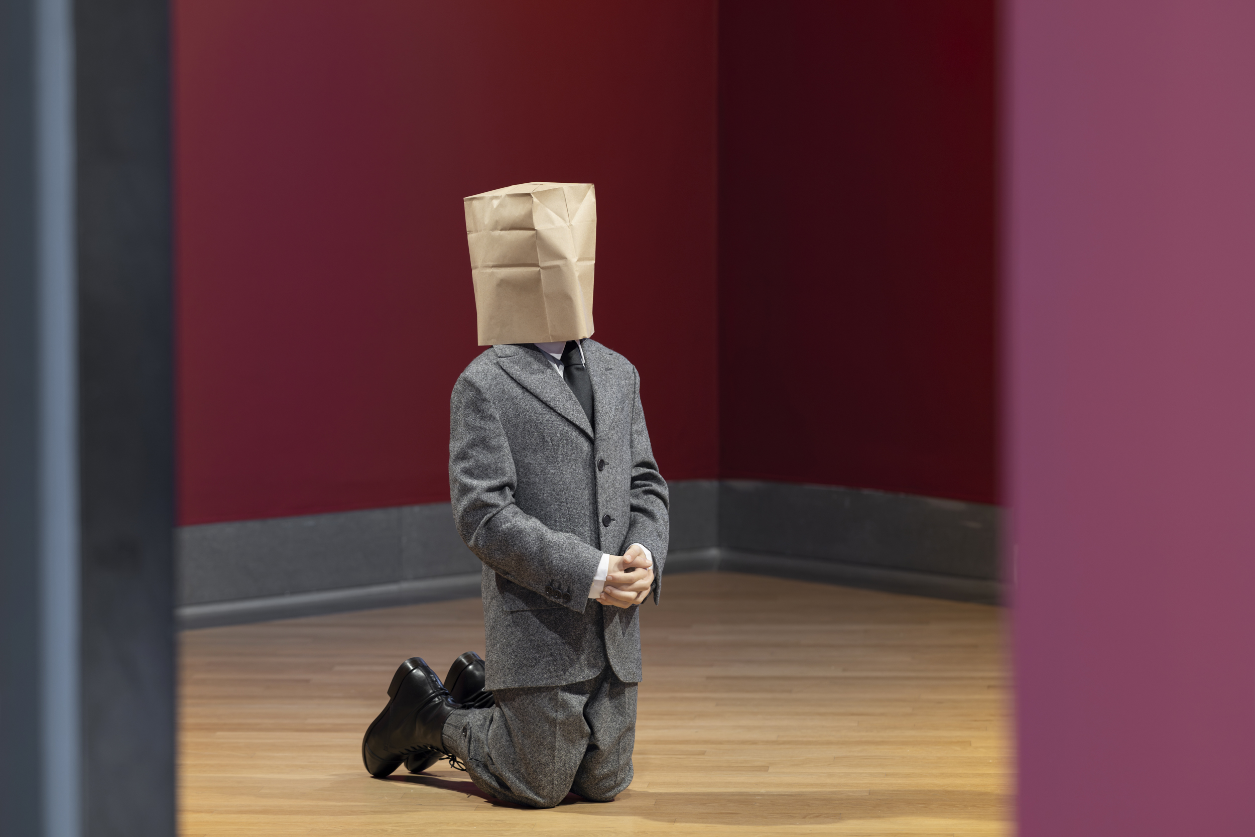 The third work, exhibited in the museum’s own halls, stems from a reworking of the iconic sculpture Him (2001), in which Maurizio Cattelan depicted Adolf Hitler kneeling in prayer, his face turned upward in an ambiguous gesture amid supplication and fiction. The figure, modeled with childlike features, evokes at first glance the innocent image of a child, generating a visual and emotional short-circuit the moment the viewer recognizes the subject’s identity.