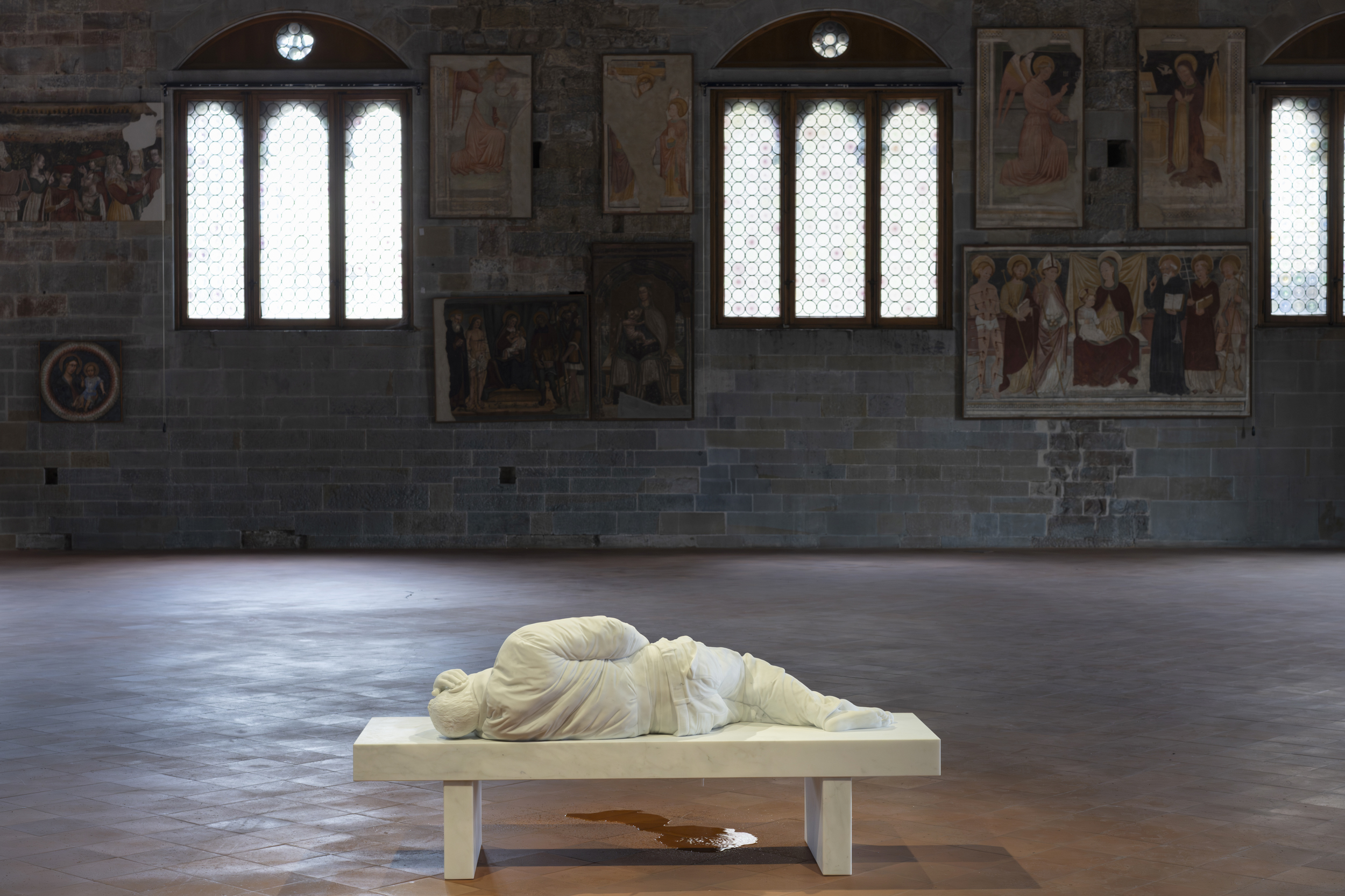 The man is wetting himself, as shown by the presence of water on the floor: a detail that not only amplifies the sculpture’s dimension of realism, but also accentuates the feeling of discomfort, of distance from socially shared norms and of estrangement. Urine thus becomes the trace of an existence, of a body that continues to live albeit, at least apparently, in its most physical dimension, insinuating the idea that the gesture made by the man could potentially constitute an act of self-affirmation.