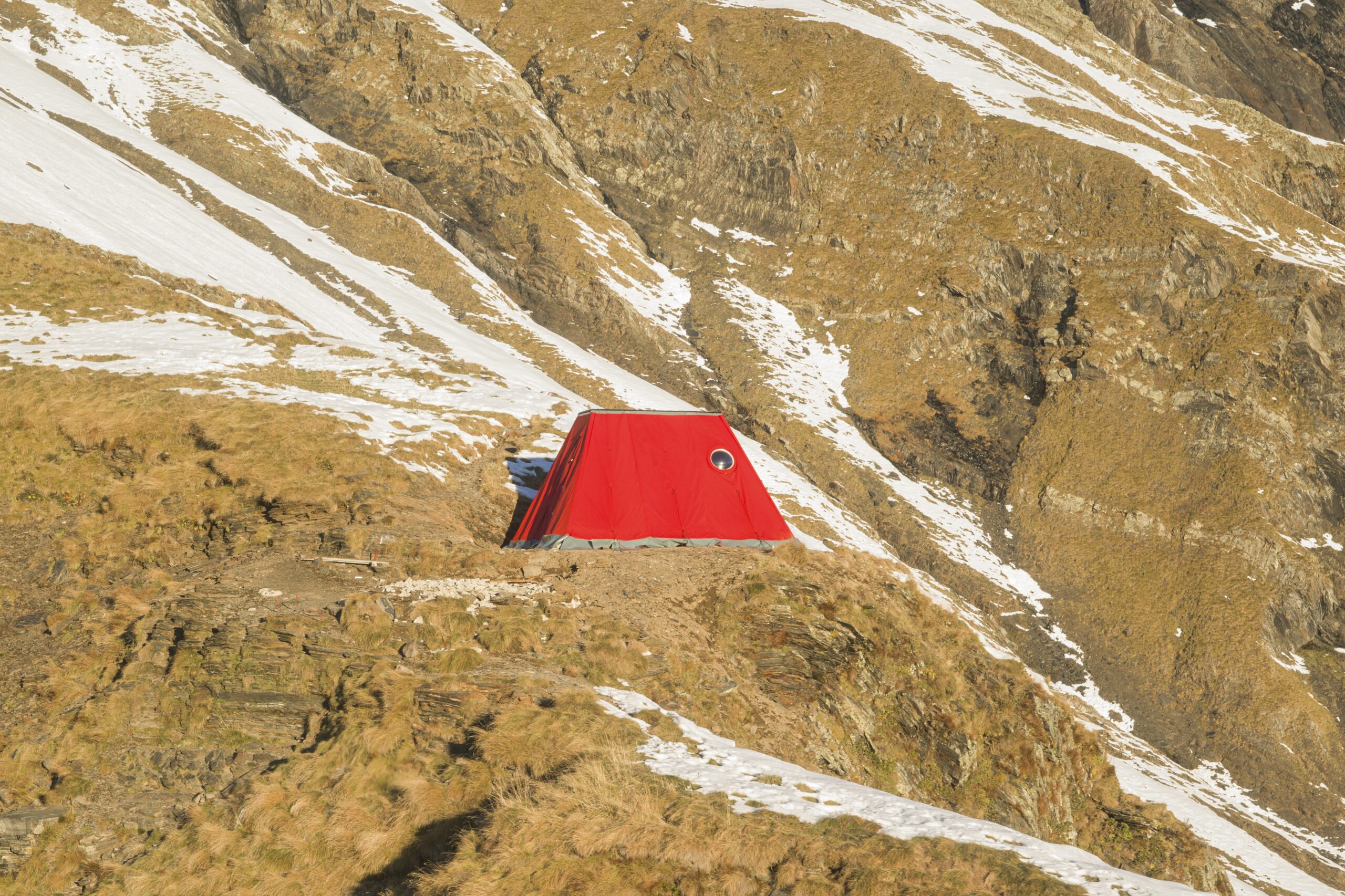 The red textile covering embraces fragility as aesthetic, refusing the bivouac’s conception as immaculate object. This covering declares vulnerability: lightweight, provisional, open to change. The structure is positioned not to dominate but to serve those who walk, study, and observe. It maintains its original shelter function while becoming symbolic and cultural value—an aesthetic experience in dialogue with alpine passage, a permanent outpost for GAMeC in high altitude.