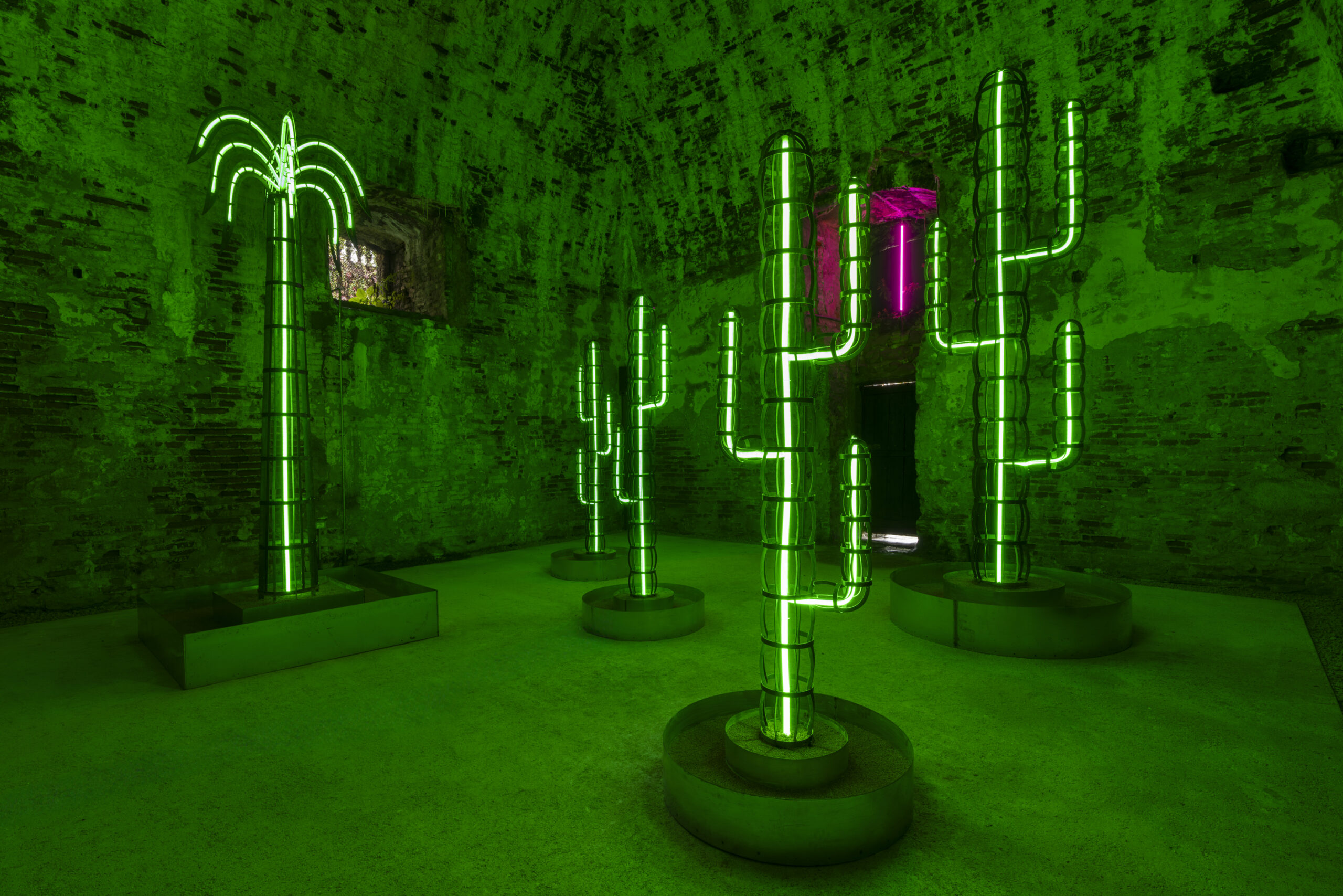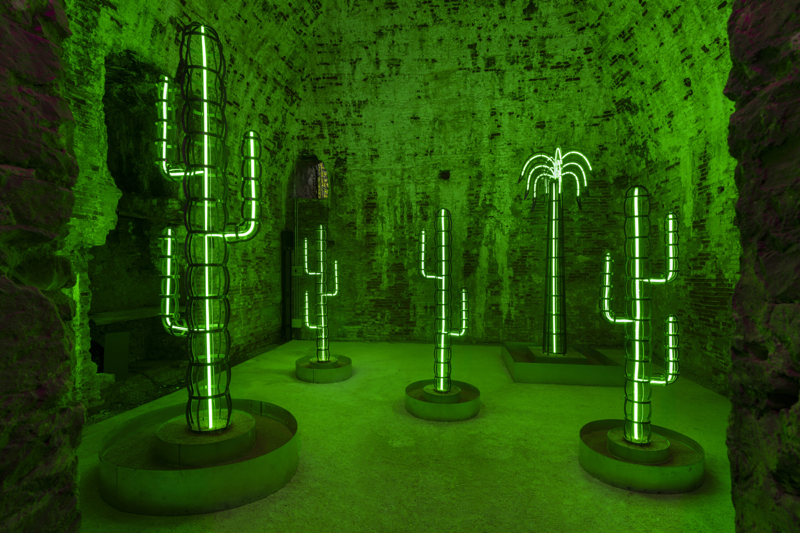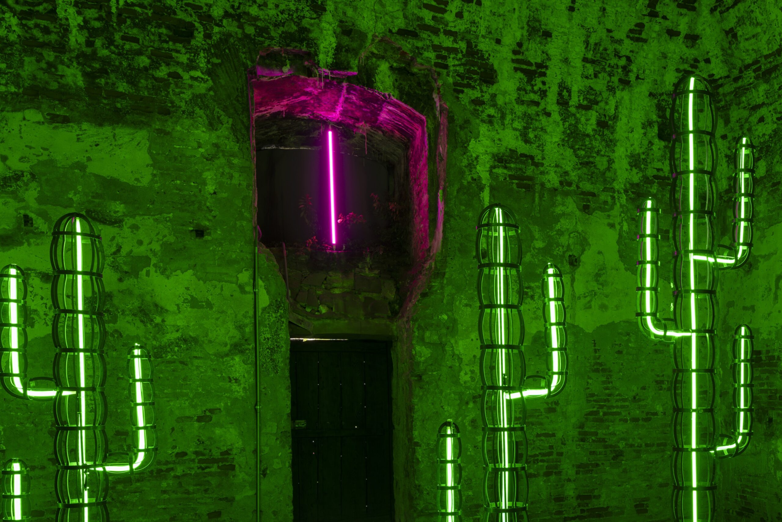 On this occasion, Iacurci’s increasing focus on environments and the management of space in relation to exhibition staging encounters the volumes of the Polveriera Superiore, the late-sixteenth-century war architecture with a rigorous form to it, now part of the Lorenzo Rota Botanical Gardens in Bergamo. The installation conceived by Iacurci constitutes a site-specific adaptation of the Dry Days, Tropical Nights project presented in 2023 at the historic Largo Treves tower in Milan. Made up of several luminous sculptural elements, the work—produced by glo™ for art—offers a reflection on landscape and its constant transformation over time.
